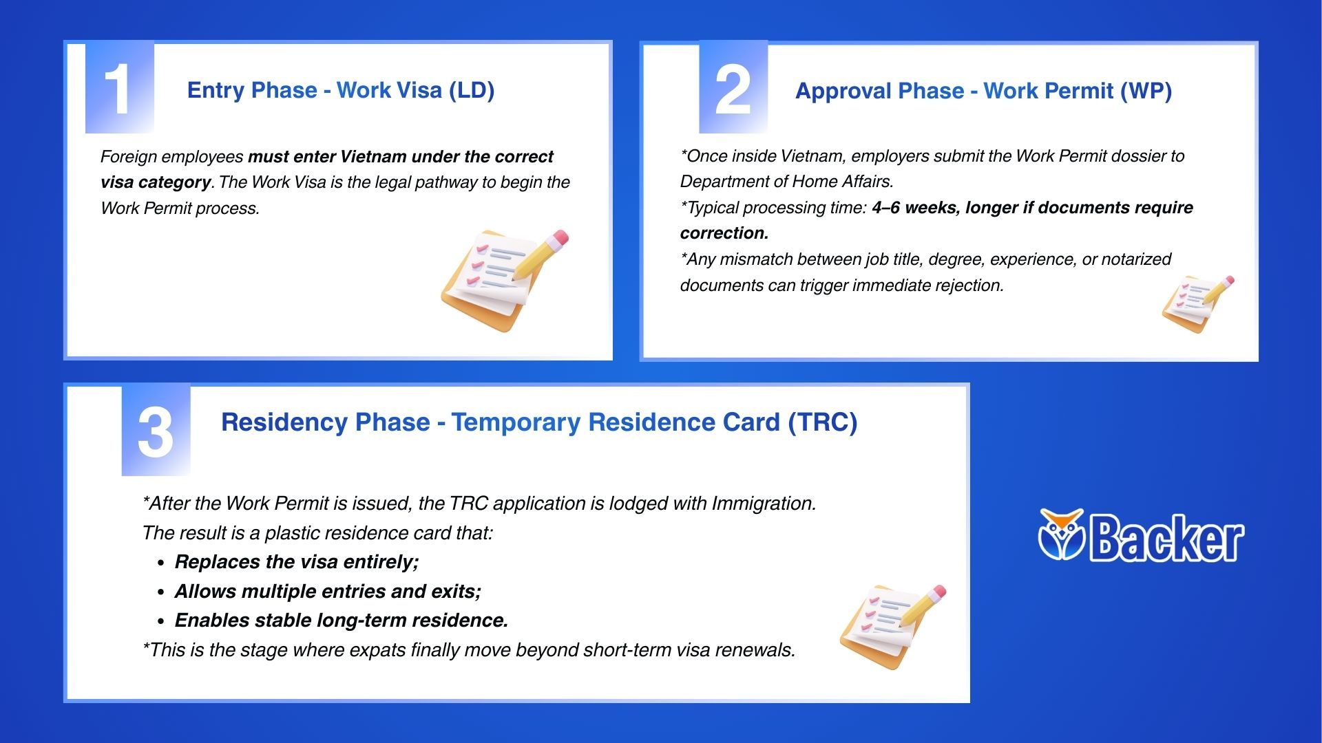 Every year, thousands of foreign professionals land a job offer in Vietnam and immediately face a confusing wall of acronyms: WP, LD, TRC. For many expats, distinguishing between a Work Permit, a Work Visa, and a Temporary Residence Card (TRC) is confusing. Enthusiasm about a new role in Hanoi and Ho Chi Minh City often collides with the complexity of Vietnam's labor and immigration system. And despite the abundance of online explanations, one fundamental issue remains consistent: